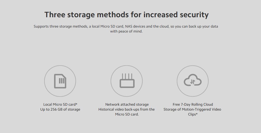 | Storage Options | MicroSD card up to 256GB (U1/Class 10 or above recommended), NAS support, cloud storage available |