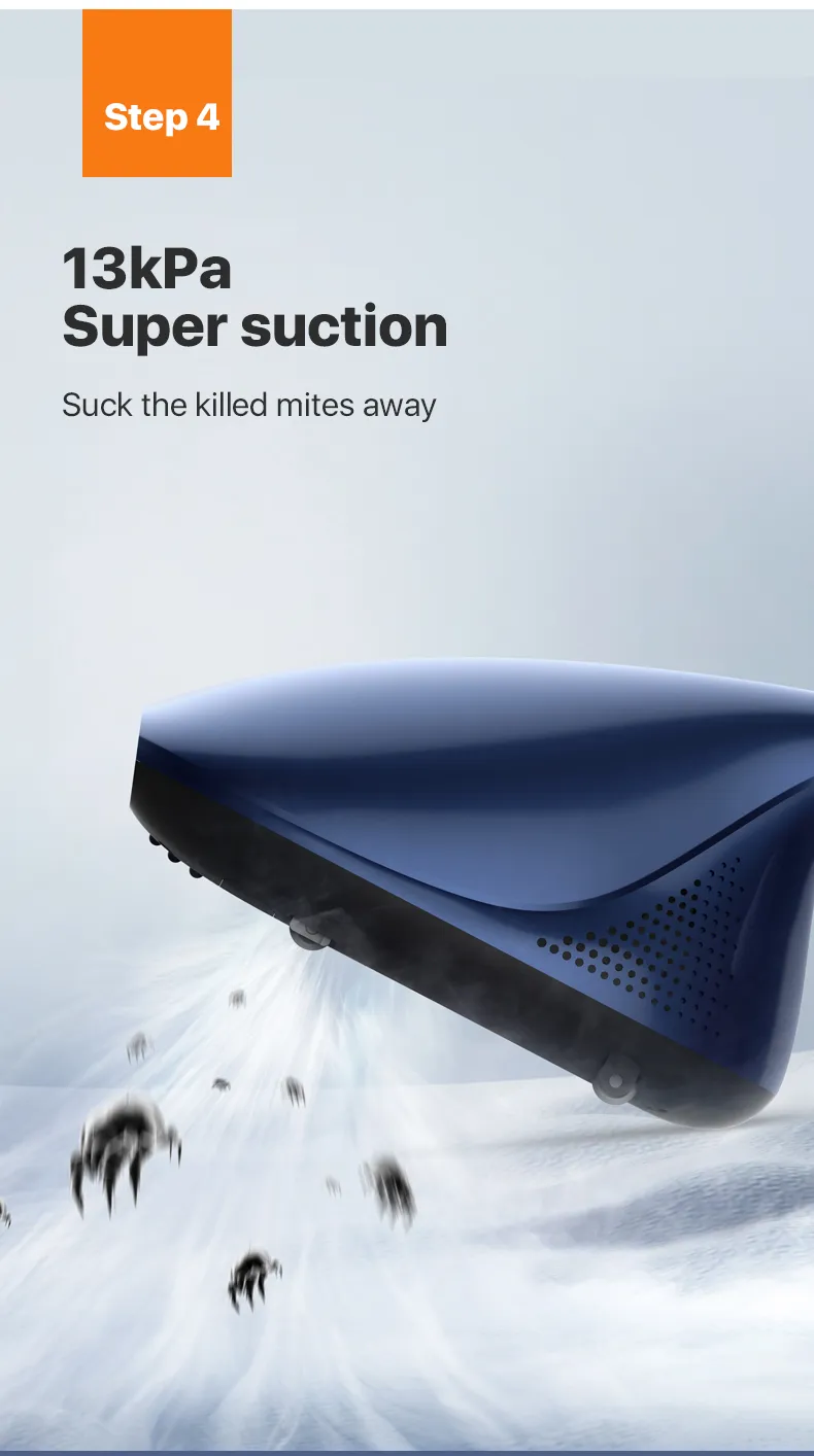 Wide suction inlet and 13kPa vacuum strength easily lift mites and fine particles from mattresses and upholstery.