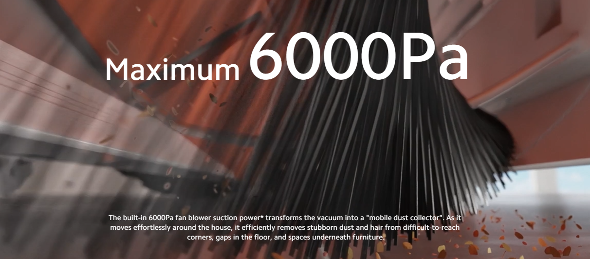 Delivers 6000Pa maximum suction for deep carpet cleaning and hard floor debris removal.