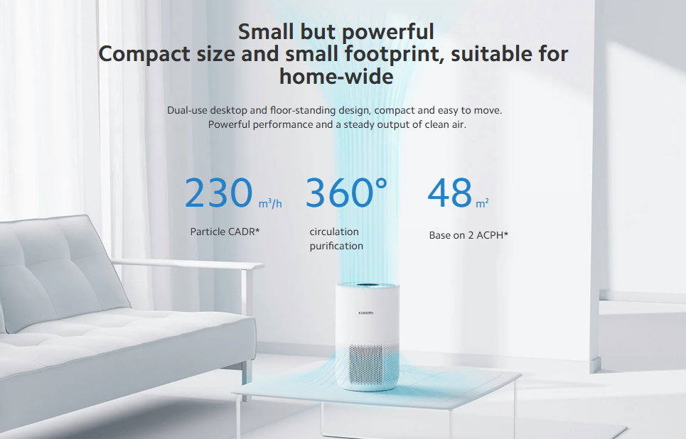 Breathe cleaner air with the Xiaomi Smart Air Purifier 4 Compact, a high-performance purifier designed for compact spaces without compromising filtration power. Certified for allergy care in California and equipped with a True HEPA filter, this purifier captures 99.97% of particles as small as 0.3μm. Enjoy ultra-quiet operation, intelligent air monitoring, and voice control—perfect for bedrooms, offices, or small living spaces.