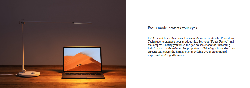 Note: Focus mode uses the Pomodoro technique to improve productivity while reducing blue light exposure. The lamp meets national and international standards for anti-glare, shadowless illumination, and visual comfort.