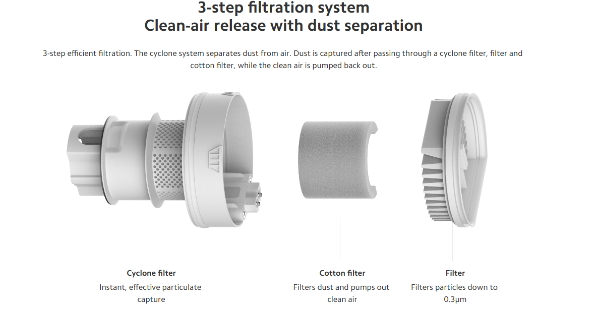 Filtration System: 3-stage (cyclone + cotton filter + HEPA filter)